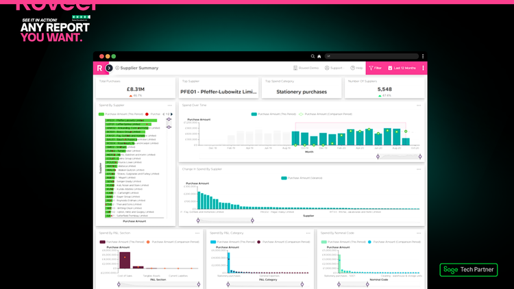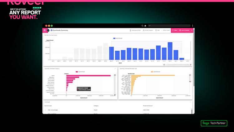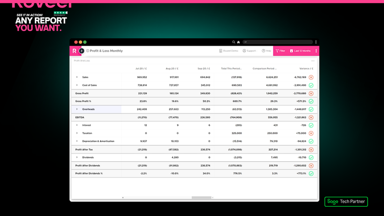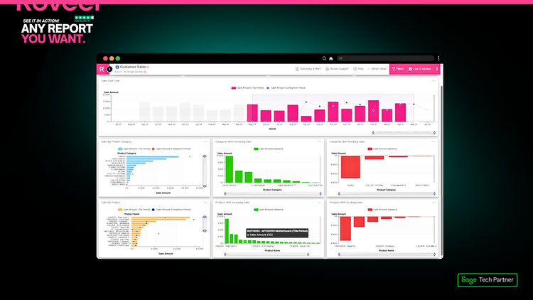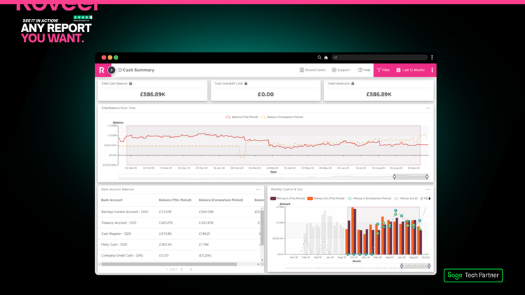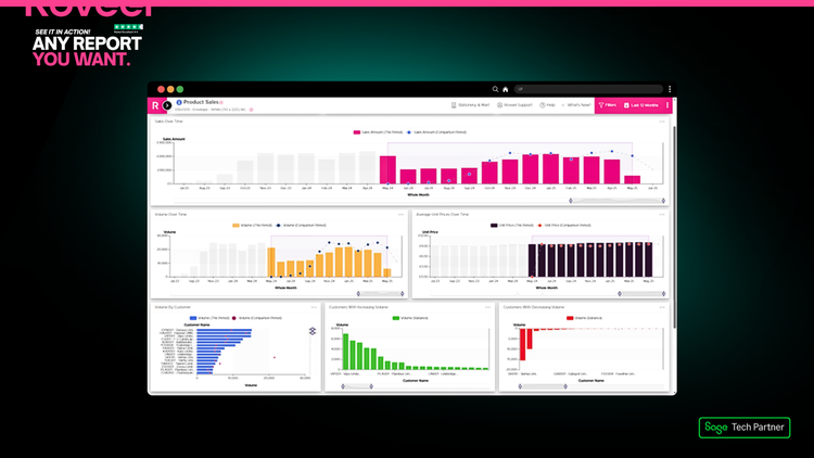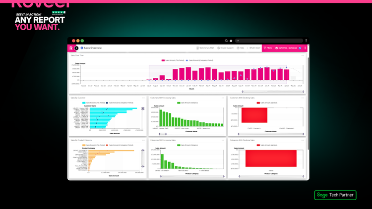 Roveel empowers SMEs and Accountants with the accessible and accurate dashboards they need to analyse their Sage 50 and Sage Accounting data. No need for numerous clunky spreadsheets, Roveel's dashboards extract and transform your Sage data from across your business. From Sales and Credit Control to the Profit and Loss and Cash, have instant visibility over your business performance.